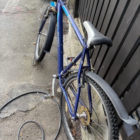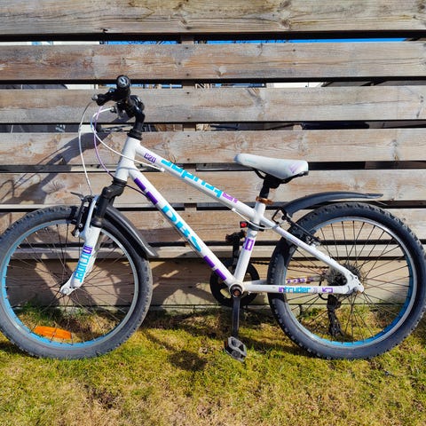 Sykkel med 6 gir merke White. MTB lite. Godt brukt, men fortsatt mye bruk igjen. Trenger nok en service på gir, kjede og brems. Rust på kjede går bort om man smører det. Bruksmerker på sete, se bilde.