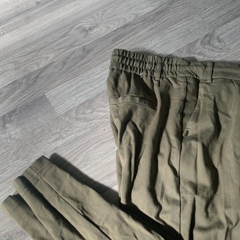 Pent brukt tynn «jogge»bukse fra co’couture selges. Militærgrønn i fargen. . To lommer og pynteknapper i front, knyting i livet og lomme på bakside.
