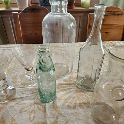 En gammel vann/ vin karaffel med malte grønne blomster ranker.