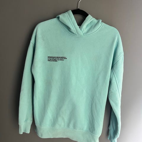 Selger en grønn hettegenser i god stand. Det er noen små vaskepupper på den, men de er knapt synlige. Genseren er veldig behagelig.