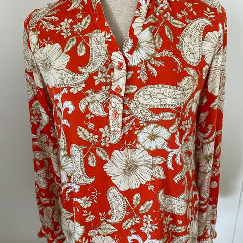 Bluse i rødt med art deco mønster. Flowy i viskose (naturmateriale). Hempe til lukning i halsen