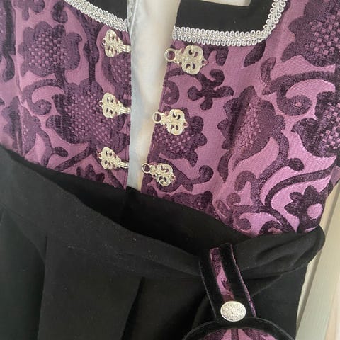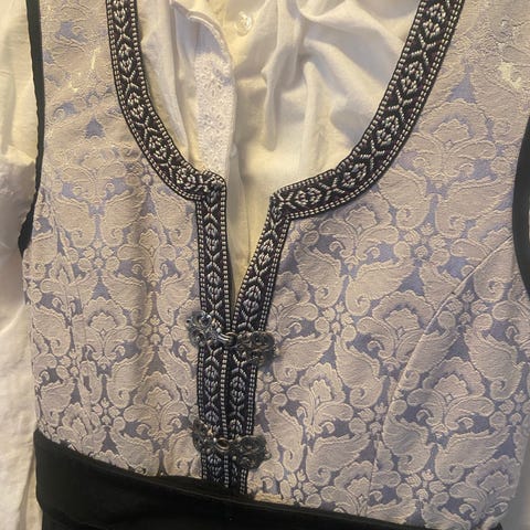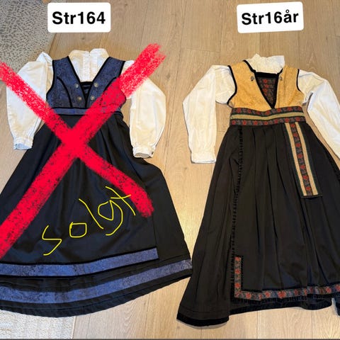 Kjempefin bunad/festdrakt str 164 i gull og sort. Skjorte og skjørt følger med. Mangler en knapp, se bilde. Vi bruker sikkerhetsnål i stedet. Hel og fin.