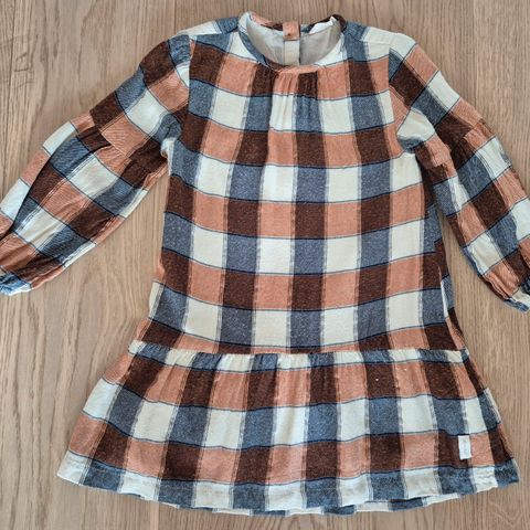 Pent brukt collagekjole fra Minymo i varm gul farge med glitter og lomme foran. Passer fint nå på høsten.