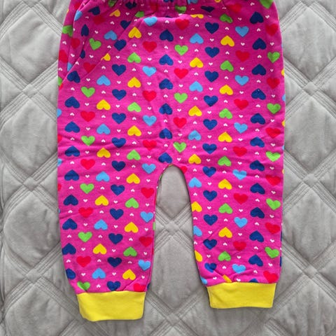 Myk og lekker bomullbukse, mørkeblå med rosa prikker. Størrelse 80 cm. Passer til baby fra 8 måneder til 18 måneder. Cubus.