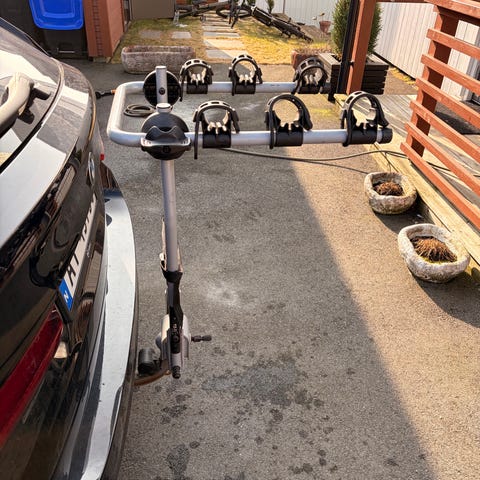 Selger et Thule HangOn 3 Tilt sykkelstativ for tilhengerfeste. Stativet er designet for å transportere opptil tre sykler, med en maksimal lastekapasitet på 45 kg (15 kg per sykkel). Det er enkelt å montere og vippbart, slik at du får tilgang til bagasjerommet selv når syklene er på plass.