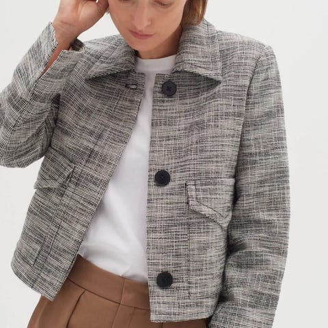 Blazer/lett jakke i bomull og viskose, gul, beige og sort stripet. Merket str. 36, stemmer bra.