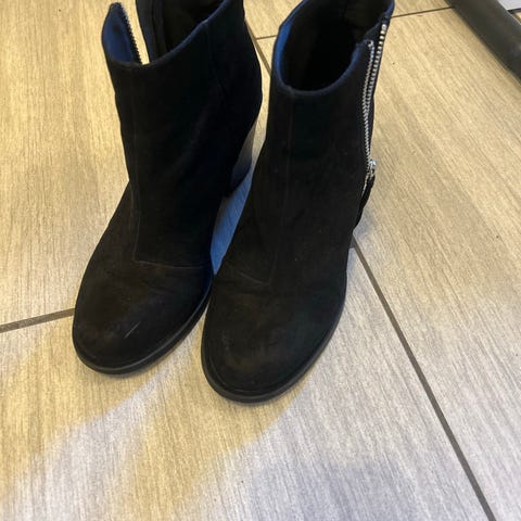 Stilige skoletter med 12cm høye hæler. Semsket skinn og stilig mønster på hælen og kanten rundt. Strl 7 1/2 tilsvarer 38. Ingen bruksmerker på skoene,men man kan jo se at de er brukt på sålen under.