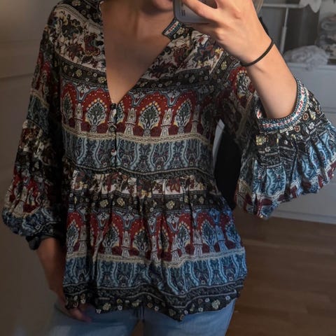 Knytebluse inspirert av Ganni-bluse. Sydd av ny duk fra Indiska i bomull. Str 42. Måler 67 cm fra midten av skulderen og helt ned. Fleksibel over bysten på grunn av tre knytebånd.