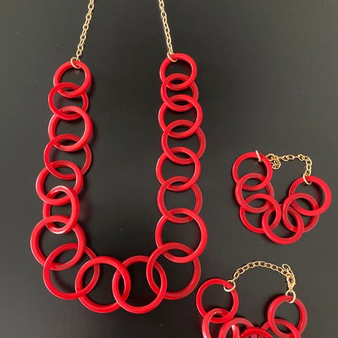 Smykkesett , 3stk halskjeder og ett armbånd. I plast, rødt smykke og armbånd er i litt tyngre materiale. Strikk i armbånd. Mål,se bilde. Selges samlet for 100kr.