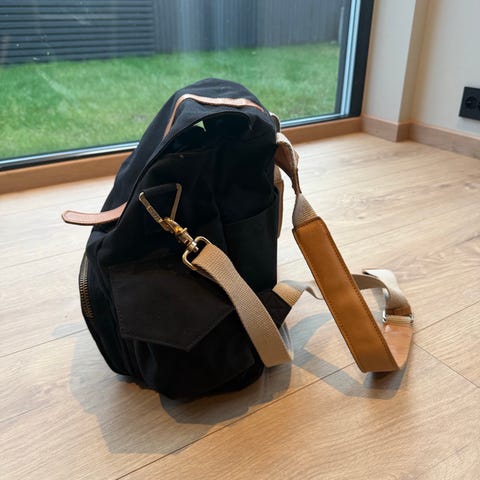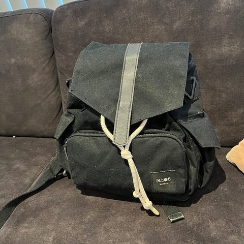 Meget pent brukt sort stellesekk med skinndetaljer fra Kaos.