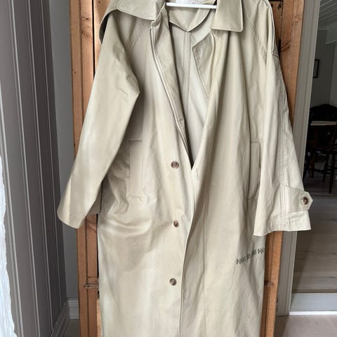 Fôret, hvit vintage kåpe/trench til høst og vinter med avtagbar krage i mørkbrun fuskepels. Dansk design. Mangler ein knapp til kragen som følger med, mangler også ein knapp på brystet. 52% bomull. Ca. 124 cm lang. Noko misfarging nederst, ikkje veldig synleg. Str. 36, passer ein small og ein liten medium.