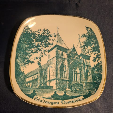 Vintage suvenir-tallerken eller lite fat fra den norske fabrikken Stavangerflint, datert 1953.
