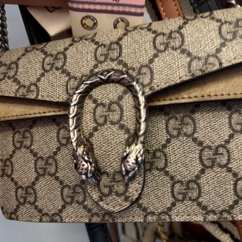 Ny og ubrukt liten veske i syntetisk stoff og kunstskinn med brunt mønster på kamelfarget bakgrunn. Justerbar stropp i kunstskinn og det som ser ut til å være en billig metall. Liten lomme inni. Jeg fikk den i gave men har kun tatt av gavepapiret. Den ble kjøpt på "Marina for shoes and bags" og kommer i pose derfra. Jeg sender gjere flere bilder.