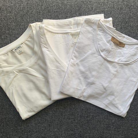 Den hvite er str 40. Den blå er str S fra Cos. Den hvite er i 100% viskose, og den blå er i 100% lyocell. Begge henger løst på kroppen