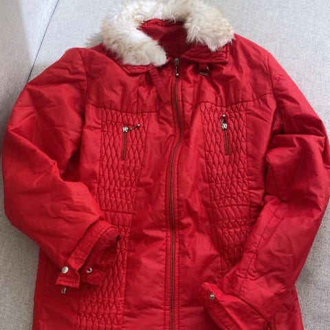 Lite og pent brukt, er i god stand. Mangler en knapp i pelsen- se bildet.