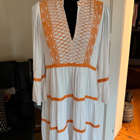 Søt kjole i myk bomull. Nydelige detaljer. Broderier i perler og blonde.
