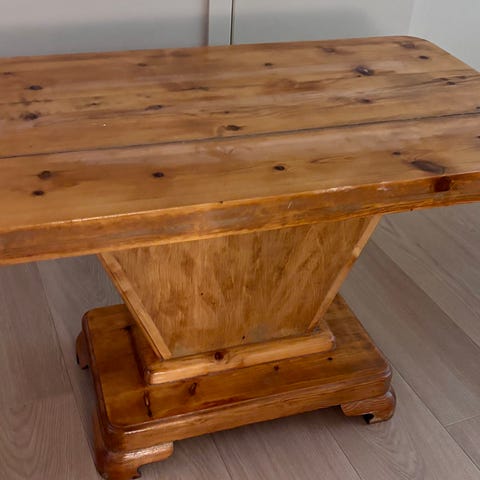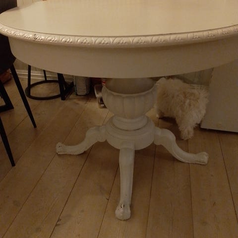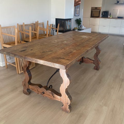 Gammelt spisebord selges. Må hentes. Følger med 2 ileggsplater på 30 cm per plate. Så bordet kan bli 186cm. Godt potensial som et restaureringsobjekt.