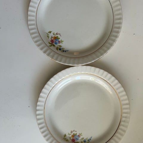 Noen bruksmerker på undersiden, og én tallerken har også et skår i seg på undersiden (bilde 5/18). Se bilder.