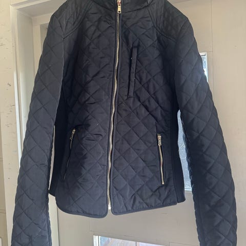 Flott marineblå jakke med gulldetaljer som glidelås/knapper
