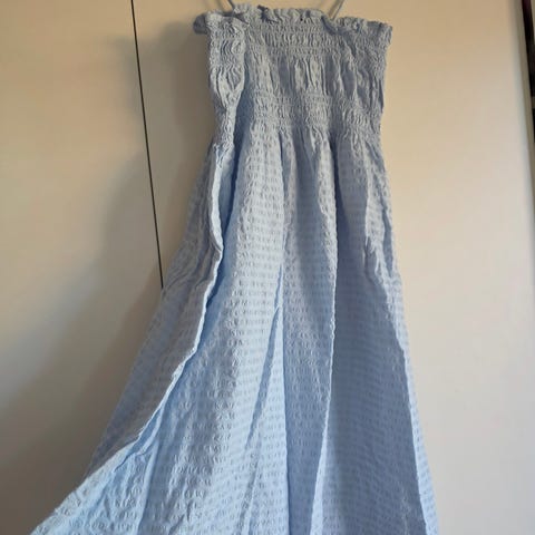 Sommerkjole med stropper og off shoulder effekt, blå -hvit striper