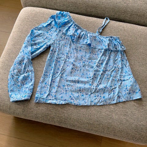 Hvit bluse med 3/4 arm og blondekant nede og ved skuldre