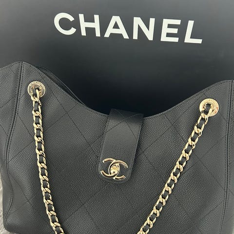 Selger en nydelig vintage CHANEL Matelasse Tote i sort kaviar skinn med gullfarget hardware.
