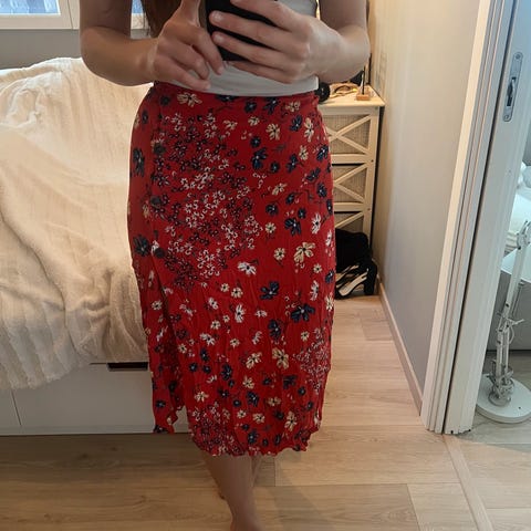 Pent brukt skjørt i rødoransje farge selges da det ikke blir brukt