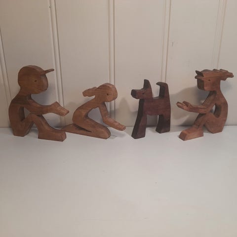 3 spesielle abstrakte trefigurer og en trehund, alle håndlaget. Dekorativt abstrakte dekorasjon for en som setter pris på håndlaget kunst. Kjenner ikke til navn på trekunstner. Se størrelser under bildene.