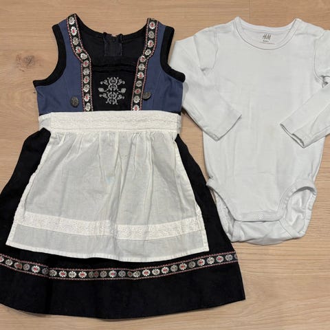 Barnebunad drakt, brysteduk og forkle. Fine drakter ikke brukt. Bare oppbevart Har flere i str 1 år.