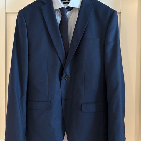 Pen blå dress str. 48, slimfit, med hvit medium skjorte til salgs. Dressen er brukt noen få ganger.