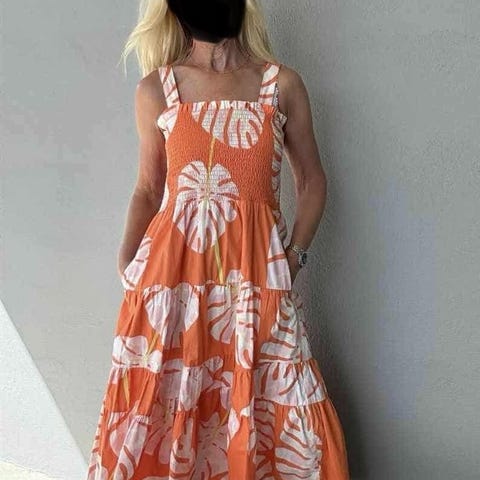 En kort kjole i luftig, vevd rami med strålegg foran og bak, volangkrage med bølgekant og skjulte knapper foran. Noe lav skuldersøm og lange ballongermer med smale mansjetter med knapper.