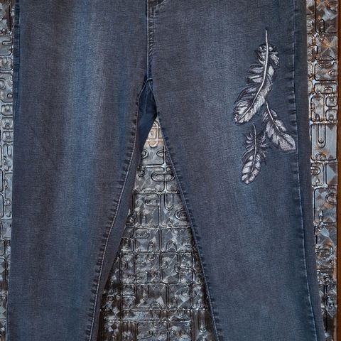 Jeans med tøffe detaljer i str. 44. Trykk knapper nede på bena som kan åpnes.