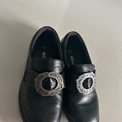 Bunadsko fra Folklore selges i str 33. To par der det ene har litt høyere hel(brun såle),mens det andre har lavere hel(svart såle). Brukt et par ganger hver.