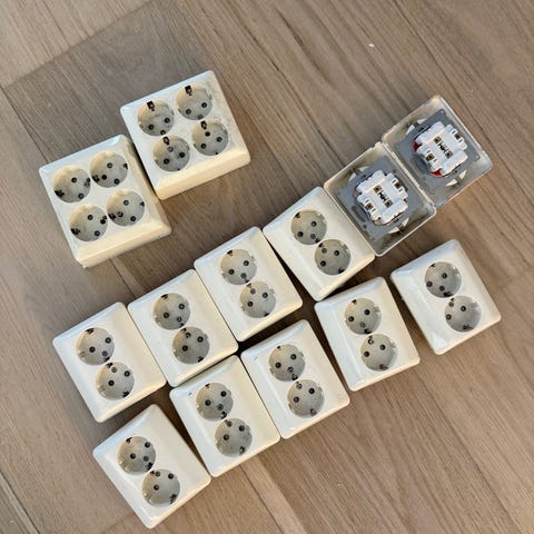 50 stk. nye og ubrukte hvite doble stikkontakt selges. Selges samlet for 1300 eller enkeltvis for 30 kr stk.