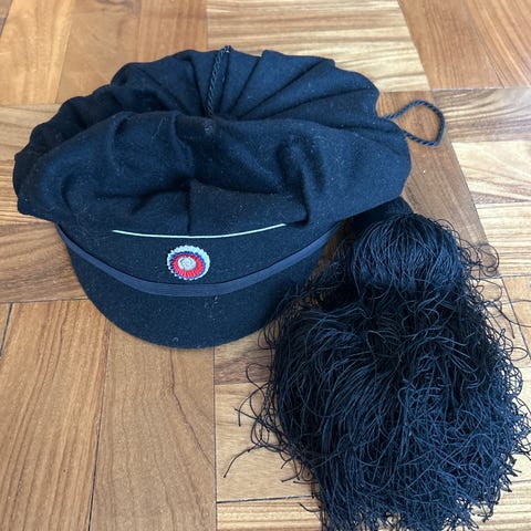 Vintage studentlue str 56 med dekorativt blikkskrin