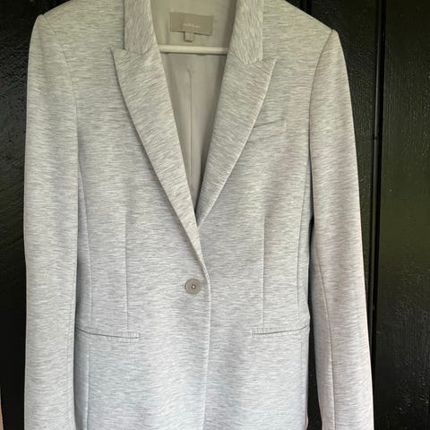 Veldig fin, helt ny og ubrukt med lappen på - pen farge burgunderlilla-ish, kanskje hakket litt mørkere enn på bildene. Jeg er en helt gjennomsnittlig str 38 og den er perfekt til meg, og litt fleksibel (4 % elastane). Helt super, men har bare blitt hengende i skapet. Kjøpt på Illums til kr 2000, helt nydelige sømmer, helfôret, to lommer, en knapp foran, tre knapper på hvert erme (en stor og en liten knapp følger med ekstra). Laget av 51 % bomull, 45 % polyester og 4 % elastane. Sømmen bak på splitten ikke er fjernet for bruk, så ny og ubrukt er den :)