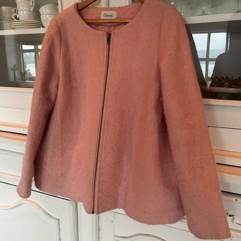 Flott kåpe/jakke fra Ganni str L. En knapp foran. Ull og polyester. Sort.