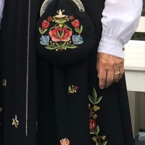 Sjal, stakk med rød vest, forkle og sølv som vist på bilder.