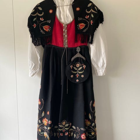 Slik bunaden er no passer den ca. en størrelse 38/40 som er ca. 165 - 170 cm. høy. Det er mulighet for å legge ned stakk og legge ut vest.