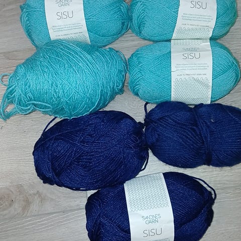 Pakke salg. Selger 7 nøster ull garn i blått og hvit av Norske produsenter.