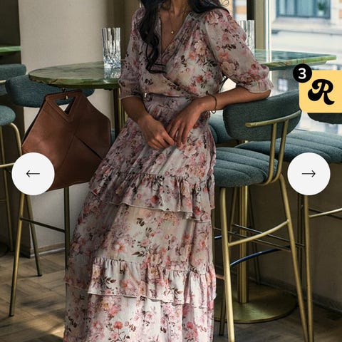 Modellen har lange, gjennomsiktige ermer, rysjedetaljer i skjørtet og skjult glidelås i ryggen. Stoffet er stretchy og komfortabelt, med mykt fòr som gjør kjolen behagelig å ha på. Passer perfekt til bryllup, sommerfester og andre festlige anledninger.