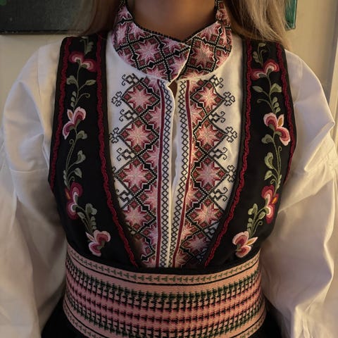 Nydelig brodert bunad som passer til deg som er minst 172 cm, men helst høyere og bruker str 36 - 38.