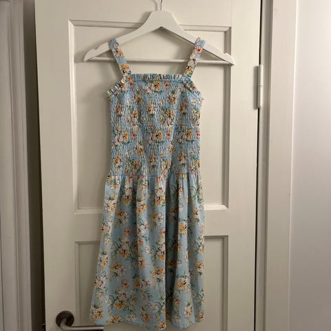 Nydelig lang sommerkjole i str 152. Fin snøring i ryggen og splitt i ene siden. Hvit med røde og blå blomster, stropper på skuldrene.