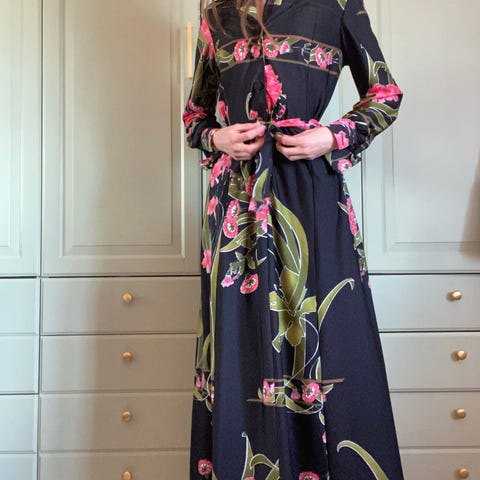 Fineste stoffet, sort bunn med fargerike blomster. Brukt en gang. Er str S, men jeg er en S og M, den er fin og «ledig», til midt på leggen. Jeg er 169cm.