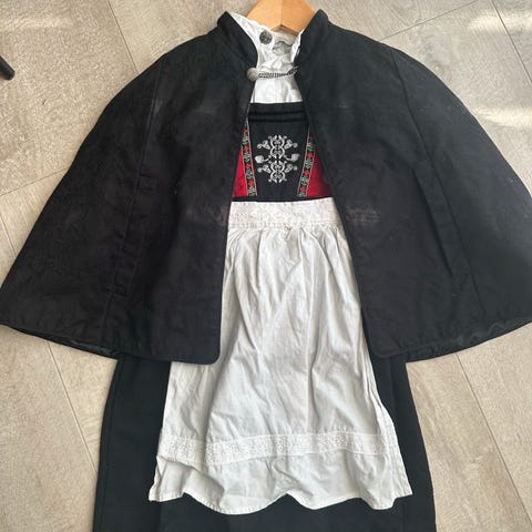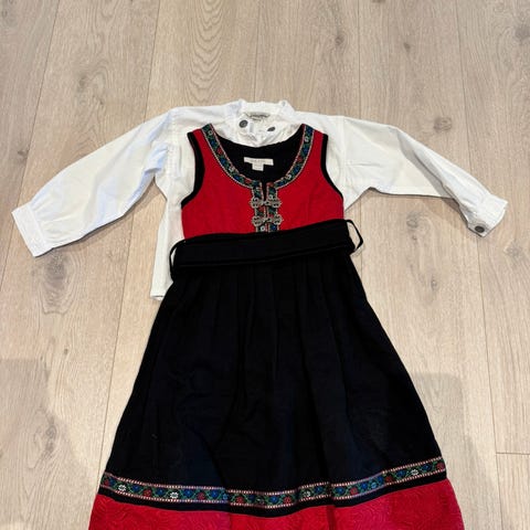 Selger en pent brukt festdrakt fra småtroll med skjorte og forkle. Forkle kan festes med 2 knapper. Skjorta er i str 104 imens festdrakten er str 104-110.