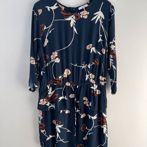 Ubrukt minikjole i gul stoff med sort mønster. Kneppet stoff. Strikk i livet. Puffede ermer.