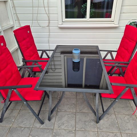 Hagebord med glassplate selges. Fargen på det ene beinet har flasset litt av men, det kan fint ordnes med litt maling. Glassplata kan tas av. Pris kan diskuteres. Send melding ved interesse på tlf 97686652