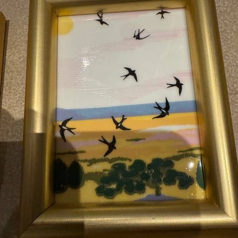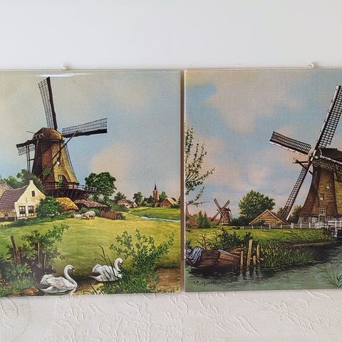 3 små bilder i porselen av gamle vindmøller