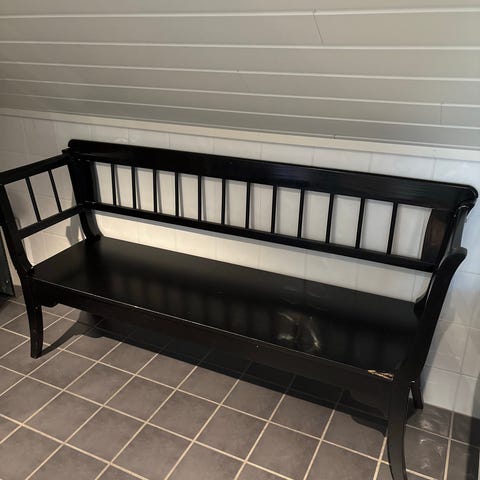 Sittebenk i svart metall og «skinn». Fine detaljer. Selges pga flytting