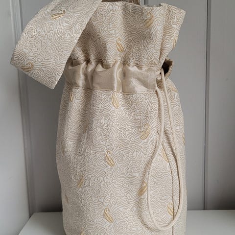 Hjemmelaget knot bag i stoff. Målene ca. 24x32 cm.